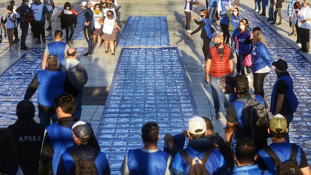 Con cuidados y protocolos, se desplegaron 13 paños azules con las fotos de los 30.000 detenidos desaparecidos en la pirámide de Plaza de Mayo y se extendió por la calle Bolívar. Durante la jornada de realizarán varias actividades en el lugar.