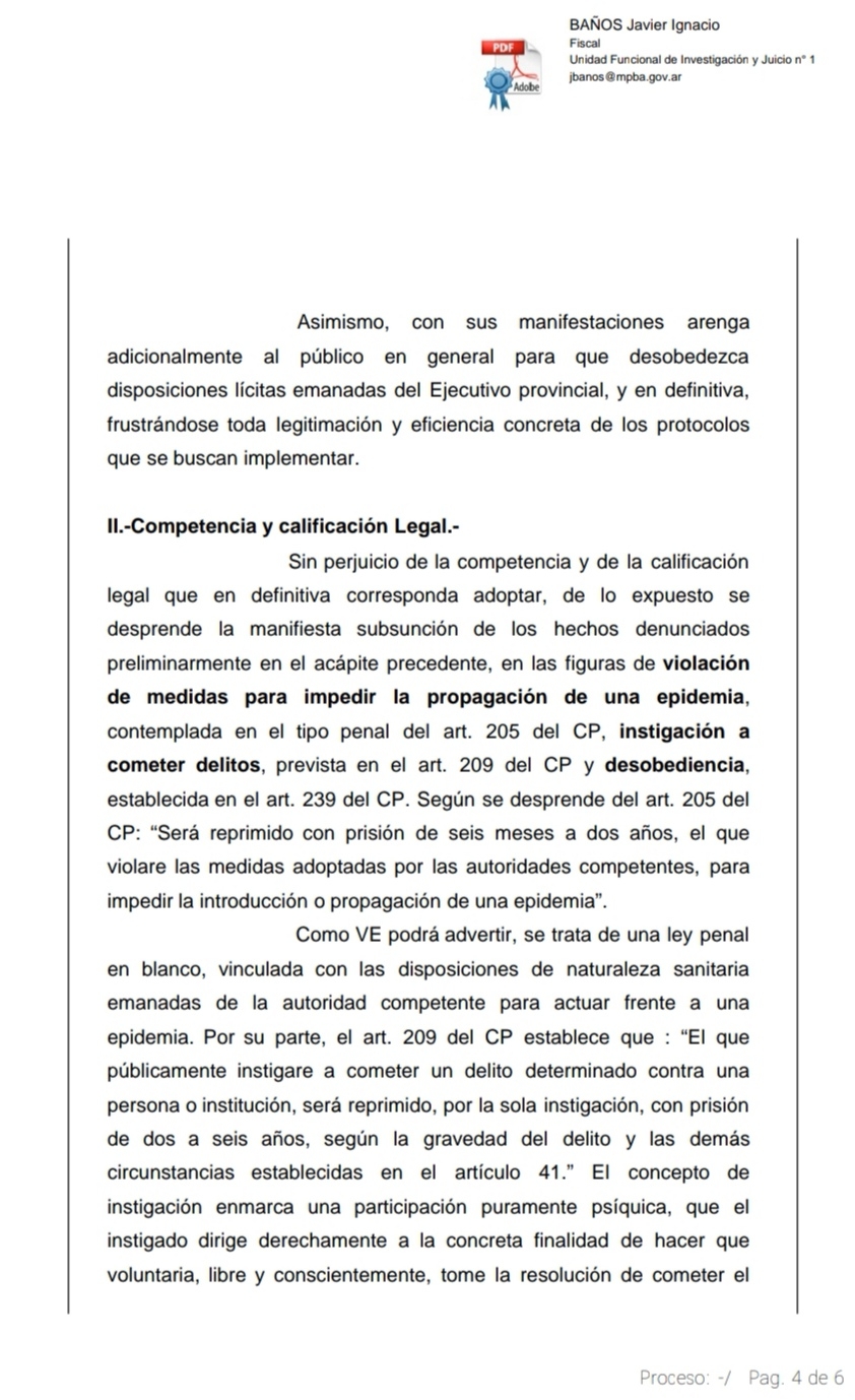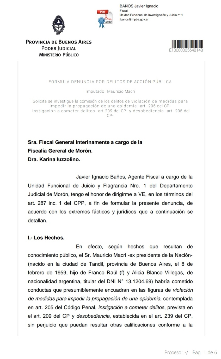 «Así, sucintamente, el ex Presidente de la Nación Argentina realiza a través de la mentada red social un llamado público a los gobernantes municipales a que desobedezcan las decisiones adoptadas por el gobernador de la provincia de Buenos Aires. Es que, más allá que puedan no resultar de su agrado, todas las medidas que los Estados –el provincial y los municipales– adopten para hacer frente a la pandemia y que puedan afectar o restringir el goce y ejercicio de derechos humanos, serán siempre limitadas temporalmente, ajustadas a los objetivos definidos conforme a criterios científicos, razonables, estrictamente necesarias y proporcionales, y por lo tanto legítimas y obligatorias», manifestó Baños en el texto de su denuncia.
