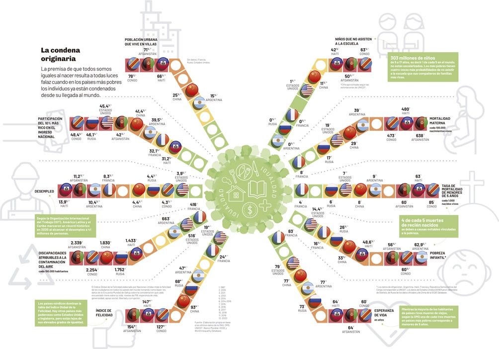 Cuando se nace en la indigencia, los niños y las niñas tienen grandes posibilidades… de permanecer desescolarizados, ser sometidos a trabajo infantil, padecer en su vida adulta trabajos precarios o desempleo, y contar con una esperanza de vida reducida. Porque las desigualdades son acumulativas y se retroalimentan, y coartan toda vía de escape a los que las padecen. Así como los ricos heredan la fortuna, no por mérito, sino por sucesión, los pobres heredan la pobreza, no por carencia de talento, sino por defecto.
