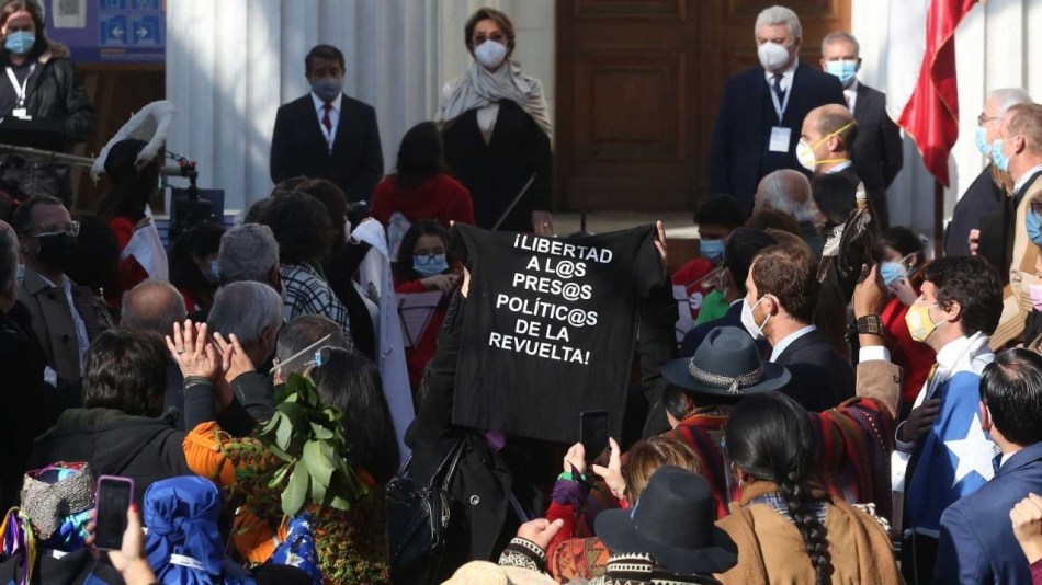 Cuando estaba por comenzar la ceremonia, un grupo de convencionales de la Lista del Pueblo, pidió que no se siguiera adelante con la actividad debido a que en las afueras de la sede el ex Congreso Nacional Carabineros reprimía a manifestantes.
