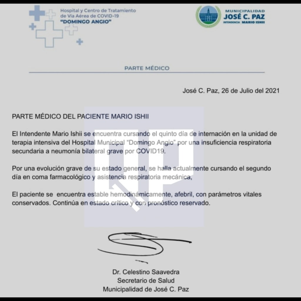 Por su parte, el Dr. Celestino Saavedra, secretario de Salud de la Municipalidad de José C. Paz, hoy firmó un comunicado en el que señala que «el Intendente Mario Ishii se encuentra cursando el quinto día de internación en la unidad de terapia intensiva del Hospital Municipal «Domingo Angio» por una insuficiencia respiratoria secundaria a neumonia bilateral grave por Covid-19″.