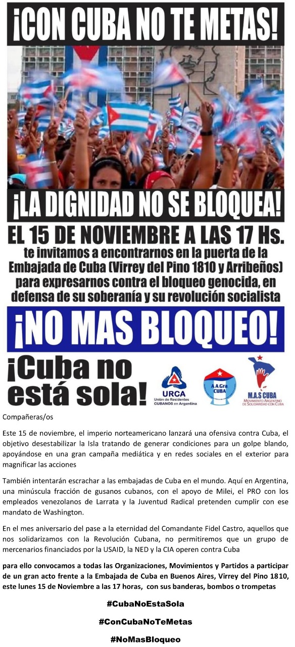 Organizaciones sociales, plataformas populares, la Red de Intelectuales en Defensa de la Humanidad y diversos colectivos civiles convocan a todos y todas a marchar frente a la embajada cubana en CABA, y demostrar que la agresión a Cuba por parte de Washington y las falsas protestas organizadas a nivel mundial para derribar un gobierno soberano, no prosperarán. ¡Sumémonos al apoyo soludario con Cuba!