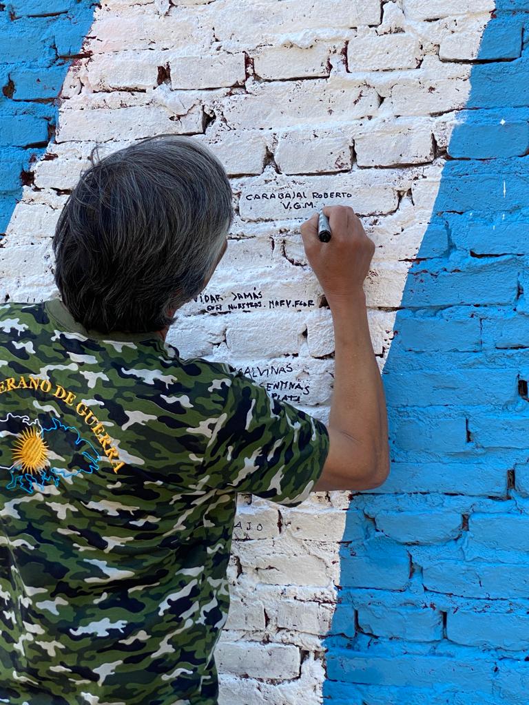 “Todavía tengo grabado el sonido de los estruendos cuando comenzaron los bombardeos: solo mi compañía tuvo 20 bajas”, recordó Roberto mientras le daba los últimos retoques al mural, cuyo boceto fue diseñado por el reconocido artista local Julius Gonup.