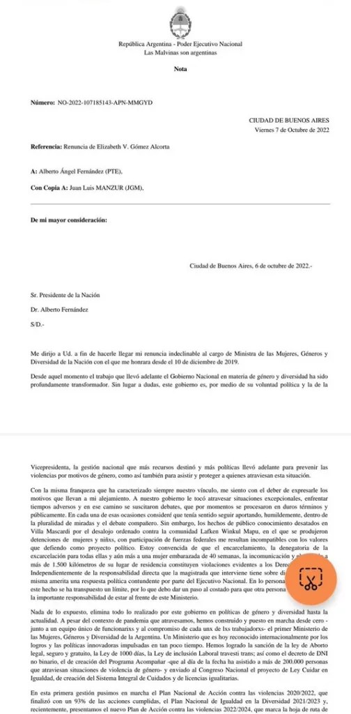 «Los hechos de público conocimiento desatados en Villa Mascardi por el desalojo ordenado contra la comunidad Lafken Winkul Mapu, en el que se produjeron detenciones de mujeres y niñxs, con participación de las fuerzas federales me resultan incompatibles con los valores que defiendo como proyecto político», expresó Gómez Alcorta a través de su carta.