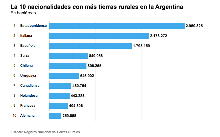 El Registro afirma que 26 millones de las 266.707.361 hectáreas de tierras rurales que dispone el país está en poder de 1.200 titulares, de las cuales 11,79 millones corresponden a firmas extranjeras y, de ellas, 1,87 millones (65 veces la ciudad de Buenos Aires) son propiedad de firmas con domicilio en guaridas fiscales .