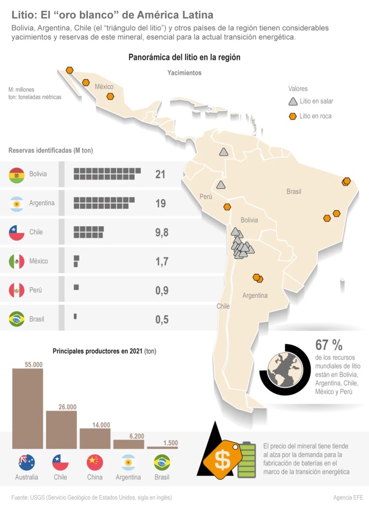 El litio es un mineral abundante a nivel global y se encuentra en diferentes formas de la arcillas, aguas geotermales, en el mar, en la roca y en salares continentales. Estos últimos son de más fácil acceso y son los que abundan en el llamado triángulo del litio (la Argentina, Bolivia y Chile). Las tecnologías desarrolladas en la actualidad hacen de los salares los territorios más económicos y rentables para acceder al mineral. Según estimaciones de las empresas automotrices, cada vehículo eléctrico requiere entre 30 y 60 kilos de carbonato de litio para sus baterías eléctricas.