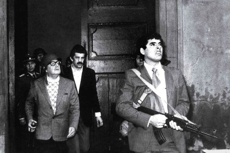 Salvador Allede y sus allegados defendieron el palacio de la Moneda hasta que resultó imposible contener el fuego de artillería y los incendios que el ejército ocasionó para forzar el desalojo y concretar el Golpe de Estado. Poco después, Allende se quitaba la vida con ese mismo fusil AK 47 que aparece empuñando en la fotografía.