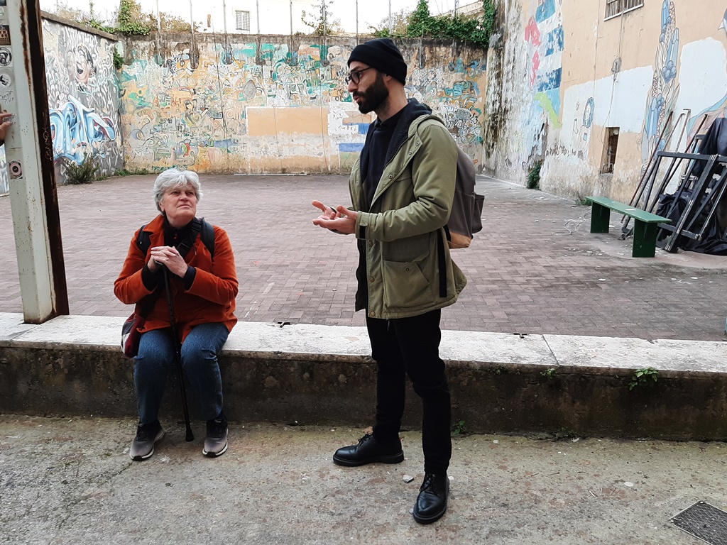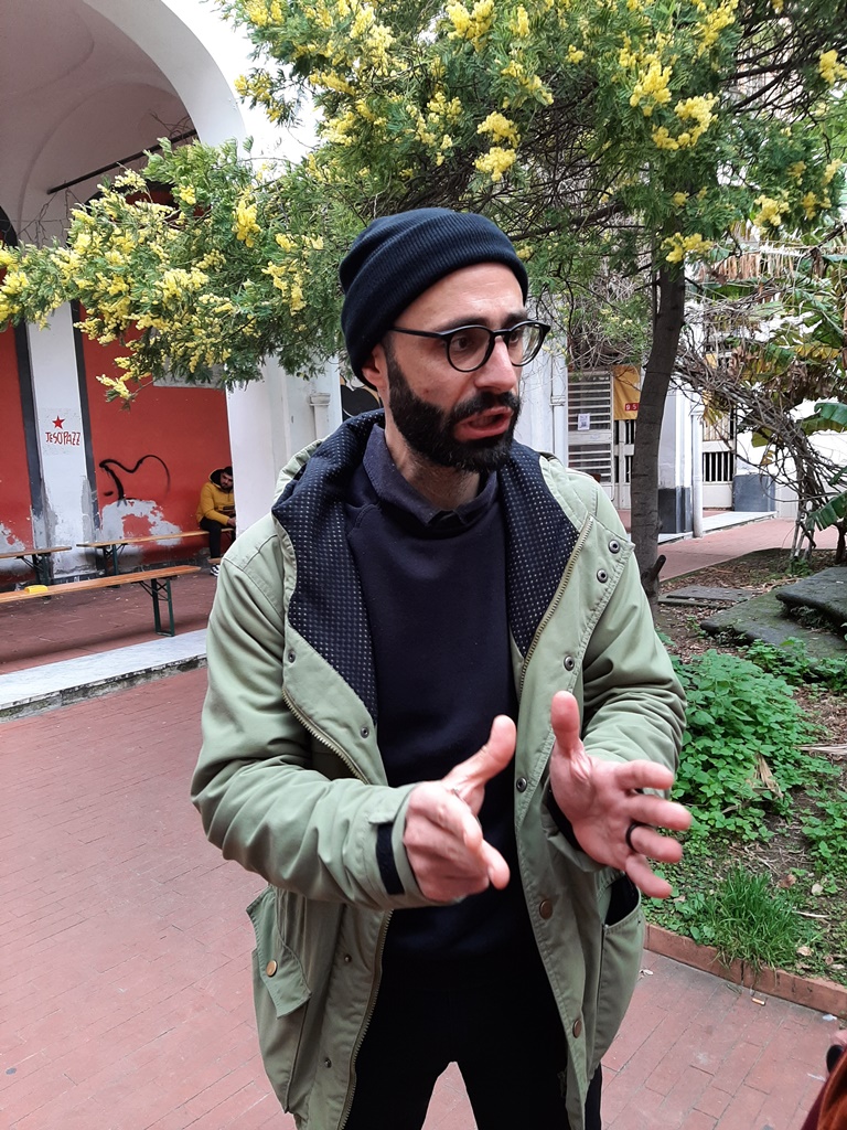 Maurizio Coppola explica a un grupo de visitantes las actividades del Centro Popular JE SO’ PAZZO de Napoles.