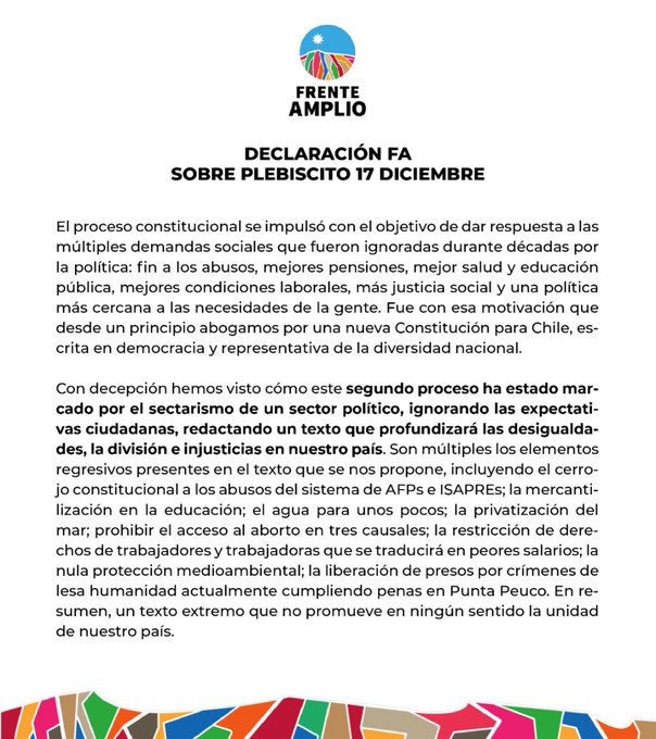 Así lo hizo saber el Frente Amplio, la coalición que aglutina a los partidos Convergencia Social, Revolución Democrática y Comunes y que llevó a Boric a la presidencia. El Partido Socialista y el Partido Comunista también se manifestaron en contra.