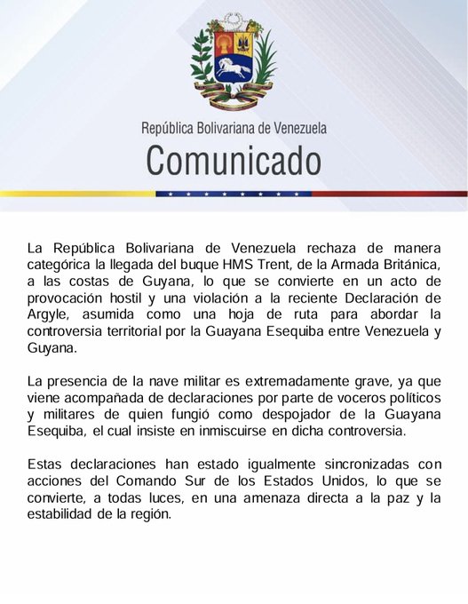 La República Bolivariana de Venezuela rechaza de manera categórica la llegada del buque HMS Trent, de la Armada Británica, a las costas de Guyana, lo que se convierte en un acto de provocación hostil y una violación a la reciente Declaración de Argyle, asumida como una hoja de ruta para abordar la controversia territorial por la Guyana Esequiba entre Venezuela y Guyana.