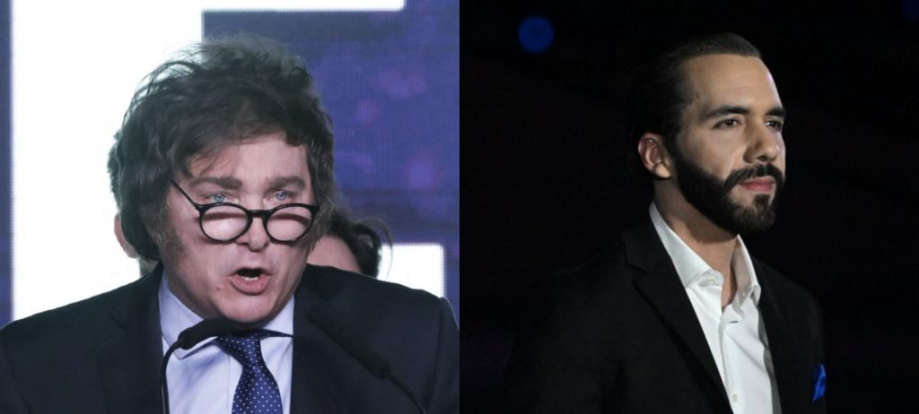 Los presidentes de Argentina (Izq), Javier Milei, y de El Salvador, Nayib Bukele, ambos con políticas ultraliberales, sumidas a Washington y con tintes neofascistas en sus políticas sociales internas.