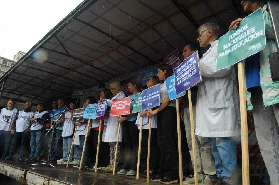 Bajo la lluvia, las y los trabajadores de la educación, cantaban consignas exigiendo paritaria nacional y fondos para educación,