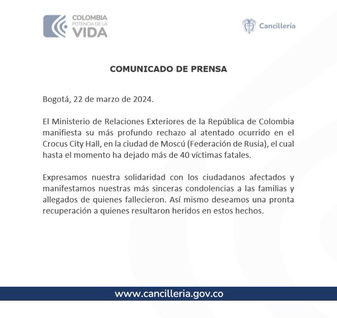 Varias cancillerías se solidarizaron con el pueblo y el gobierno de la Federación Rusa ante la barbarie del ataque a su población civil.