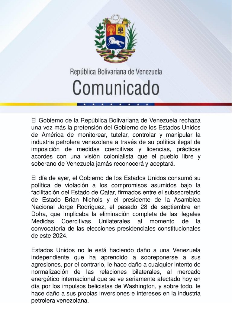 #Comunicado 📢 Venezuela rechaza una vez más la pretensión del Gobierno de los Estados Unidos de América de monitorear, tutelar, controlar y manipular la industria petrolera venezolana a través de su política ilegal de imposición de medidas coercitivas y licencias, prácticas… pic.twitter.com/1FjCkmy8hi