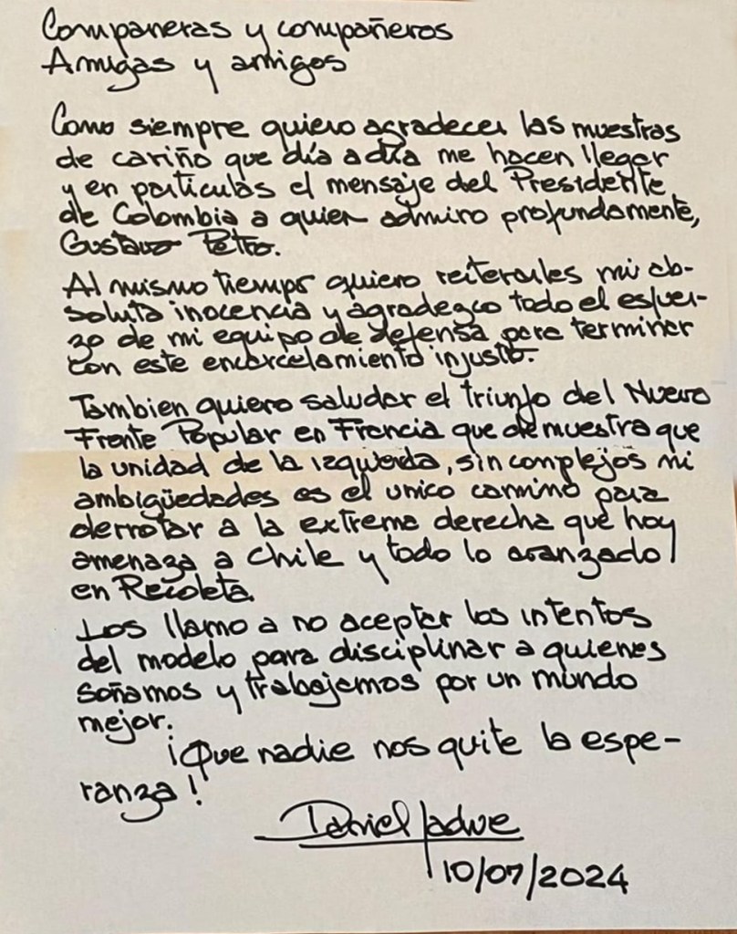 Jadue inició su carta con un agradecimiento a sus seguidores y al presidente de Colombia, Gustavo Petro, a quien manifestó admirar profundamente: