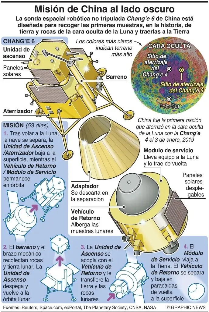Es preciso destacar que, la sonda Chang’e-6, similar a su predecesora, Chang’e-5, está compuesta por un orbitador, un módulo de alunizaje, un módulo de ascenso y un módulo de regreso. Lanzada el 3 de mayo, la combinación de módulos de alunizaje y ascenso tocó el área designada en la cuenca del Polo Sur-Aitken el 2 de junio.Here
