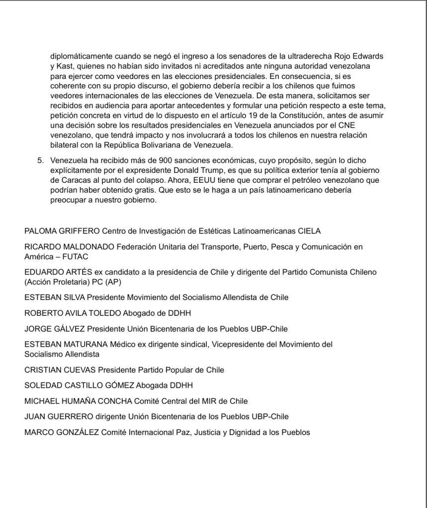 En un documento al que Quinto Poder accedió, los veedores chilenos en las elecciones venezolanas respaldan el resultado favorable a Nicolás Maduro, e instan a su Canciller, Alberto Klaveren, a no seguir el juego de intereses ajenos a Chile.