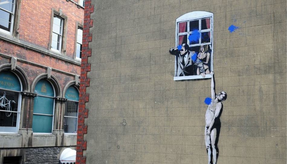 Este lunes, el artista dejó un nuevo grafiti en una pared cerca del puente de Kew, en Richmond, en el suroeste de Londres. La nueva obra representa una cabra montesa encaramada sobre la estrecha columna de una casa, de la que caen unas rocas. A la derecha, una cámara de vigilancia real está dirigida hacia el dibujo.