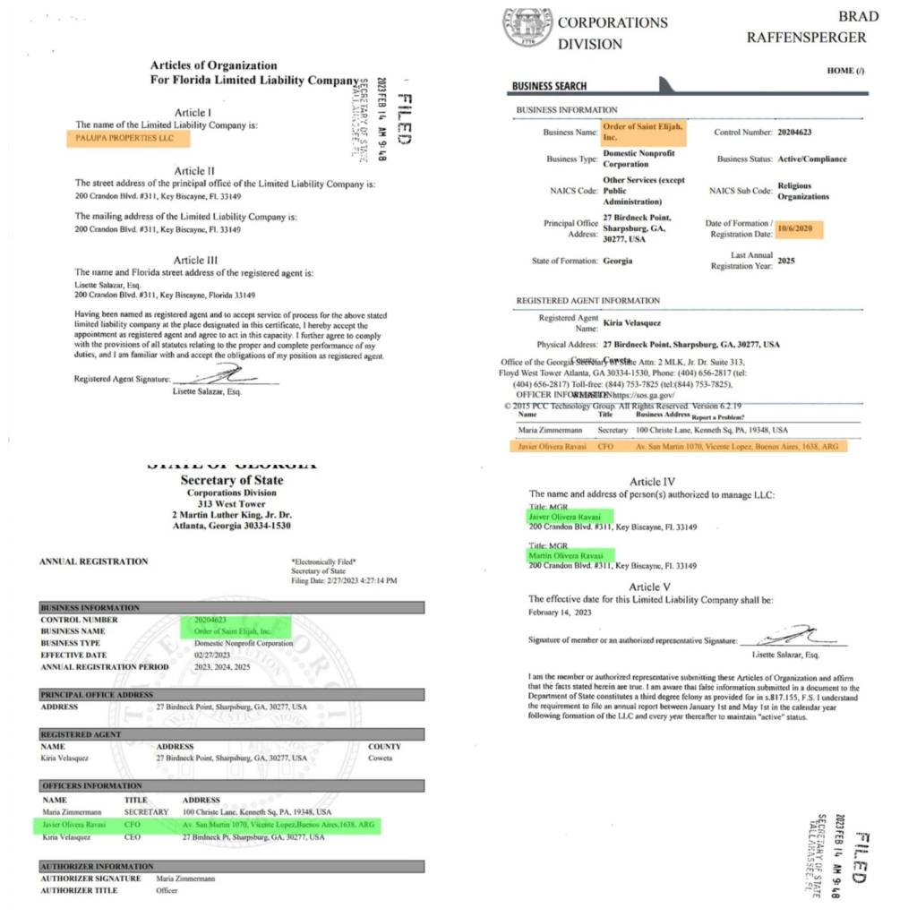 Una sociedad vinculada al cura Ravasi radicada en EEUU, financia el proyecto para liberar a los genocidas de la última dictadura cívico militar. El sacerdote es el jefe de la organización Order of Saint Elijah, también con sede en Vicente López. Y la otra es la Palupa Properties L.C., una ONG cuya sede es la enorme mansión del hermano del cura, el ginecólogo obstetra antiaborto Martín Ravasi.