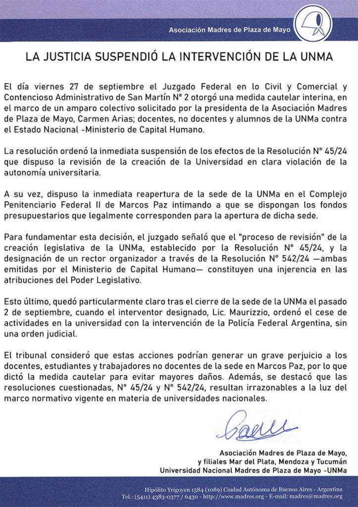 La resolución ordenó la inmediata suspensión de los efectos de la Resolución N° 45/24, que dispuso la revisión de la creación de la Universidad, en clara violación de la autonomía universitaria. Este miércoles 2 de octubre, a las 14, se hará una manifestación en apoyo a la Universidad, frente a la Casa de las Madres, Hipólito Yrigoyen 1584 de la Ciudad de Buenos Aires.