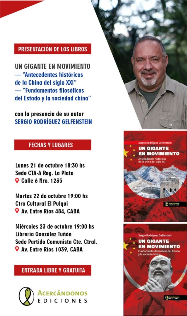 Una de las editoriales más prolíficas y activas del pensamiento crítico argentino acaba de sacar Un gigante en movimiento de Sergio Rodríguez Gelfenstein que se presentará en diversos lugares de CABA y la ciudad de La Plata. China su proyección y las consecencuas para la gepolítica global son tratadas aquí con enorme seriedad y lucidez teórica.