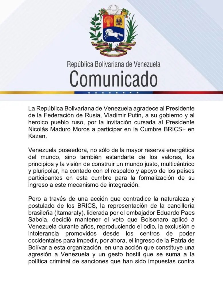 El presidente Nicolás Maduro expresó ayer su rechazo a la decisión de la cancillería brasileña de mantener el veto que impide su ingreso al grupo de los BRICS, acción que calificó como «una agresión» y un gesto «hostil» por parte del país vecino. Venezuela emitió un comunicado.