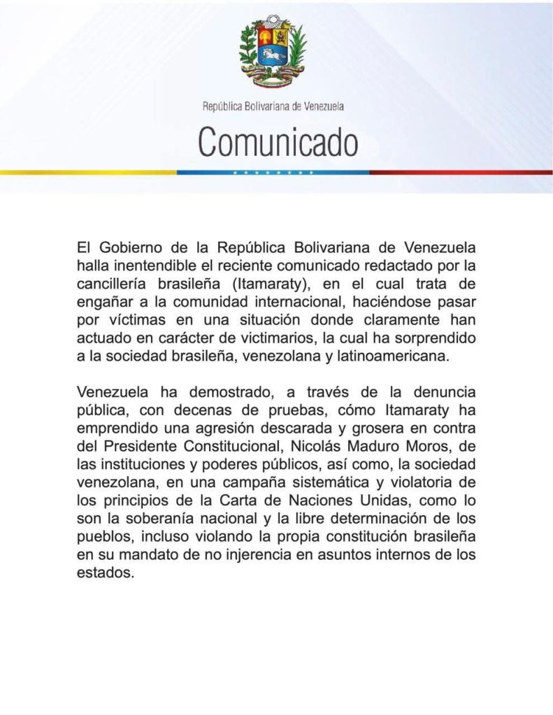 «El Gobierno brasileño constata con sorpresa el tono ofensivo adoptado por manifestaciones de autoridades venezolanas con relación a Brasil y sus símbolos nacionales», dijo en un comunicado el Ministerio de Relaciones Exteriores, Itamaraty.
