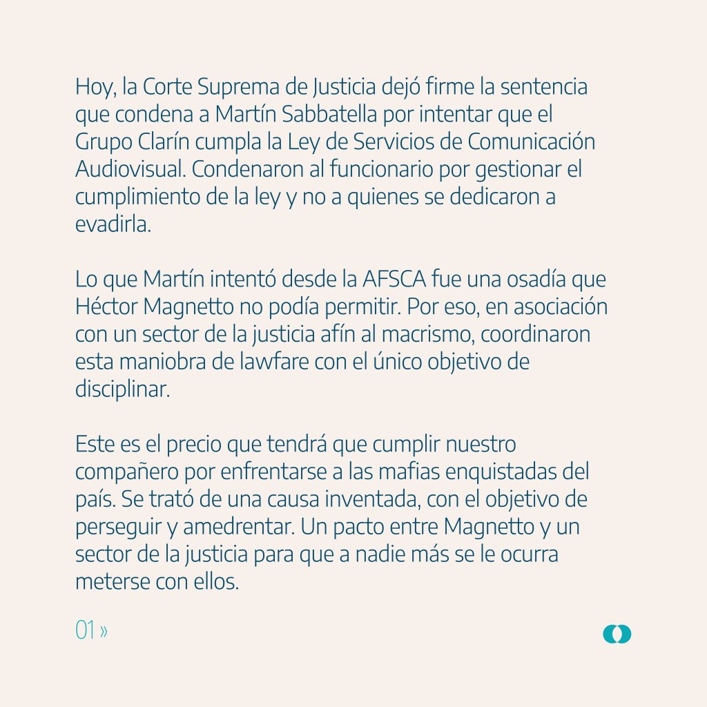 En virtud de la resolución dictada por la Corte Suprema de Justicia de la Nación en fecha 29 del corriente mes y año, en la causa judicial identificada como “CFP 11778/2015”, que ha dejado firme la condena que me inhabilita para ejercer cargos públicos por el período de un año, la que me ha sido impuesta por el solo hecho de perseguir el cumplimiento de la Ley de Servicios de Comunicación Audiovisual por parte de todos los obligados a la misma, sin privilegios para ningún grupo por más poderoso que sea.