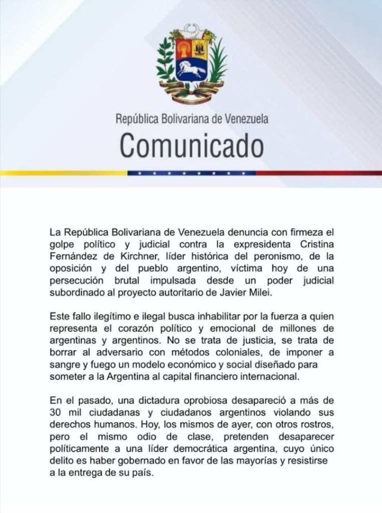 La República Bolivariana de Venezuela denuncia con firmeza el golpe político y judicial contra la expresidenta Cristina Fernández de Kirchner, líder histórica del peronismo, de la oposición y del pueblo argentino, víctima hoy de una persecución brutal impulsada desde un poder judicial subordinado al proyecto autoritario de Javier Milei.