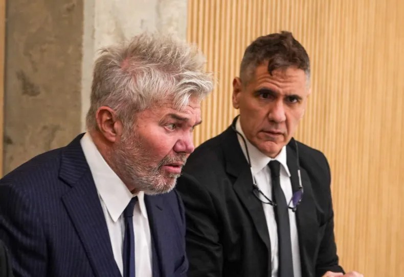 Fernando Burlando y al fondo su asociado, el penalista Javier Baños, durante una audiencia en la provincia cuyana.