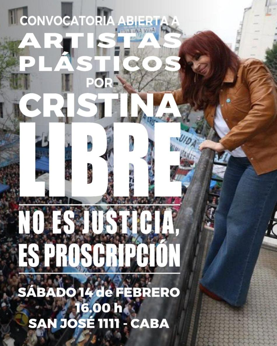 Bajo la consigna “Cristina Libre”, un nutrido grupo de artistas plásticos argentinos realizará una jornada de acción política y cultural el próximo sábado 14 de febrero a las 16:00 hs en San José 1111, Ciudad de Buenos Aires.