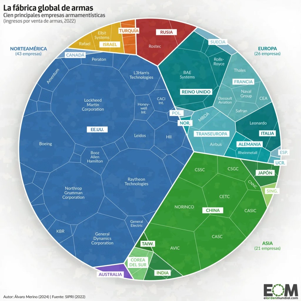 Por su parte, la mayoría de las empresas estadounidenses en esta lista vieron crecer sus ganancias en un 3,8 %, aproximadamente 334.000 millones de dólares. Cinco de las seis empresas más importantes a nivel mundial son estadounidenses: Lockheed Martin, RTX, Northrop Grumman, General Dynamics y Boeing. (El cuarto lugar de este grupo lo ocupa la británica BAE System). (https://www.sipri.org/visualizations/2025/sipri-top-100-arms-producing-and-military-services-companies-world-2024).