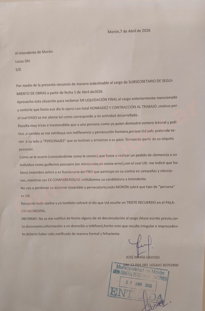La dimisión, presentada este 7 de abril, no se limitó a formalizar la salida. Gayoso resaló que ejerció el cargo con “total honradez y contracción al trabajo” y reclamó su liquidación final conforme a sus funciones.