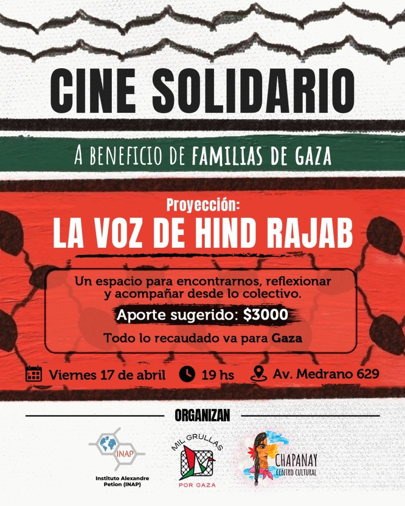 Este viernes 17 de abril a las 19 horas, en Av. Medrano 629, se realiza una jornada de cine solidario con la proyección del film La Voz de Hind Rajab, una obra que interpela desde lo más profundo y convoca a la acción colectiva. La actividad, organizada por Mil Grullas por Gaza, el Centro Cultural Chapanay y el Instituto Alexandre Pétion, propone un espacio de reflexión, encuentro y solidaridad concreta con las familias palestinas.