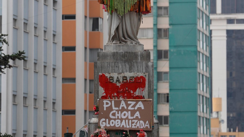 Descolonización: Colectivo Mujeres Creando viste de chola a la estatua de Isabel la Católica en La Paz